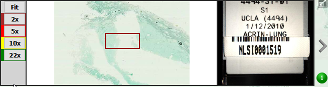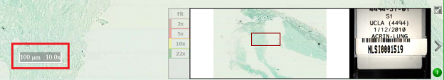 The following example shows a sample with a 10x magnification factor applied. The Caliper tool on the bottom-left of the image shows the current magnification factor. You can move the Caliper to a differentposition on the screen. Double-click (or touch and hold) the Caliper to return it to its original position.
