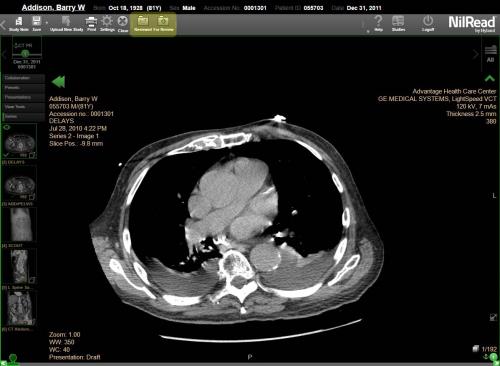 When viewing a study in the image viewer, icons for the review folders are shown in the toolbar. The highlighted icon indicates which folder the study currently belongs to. For example, the following study is in the For Review folder. Once the study has been reviewed, select the Reviewed icon to move the study to the Reviewed folder.